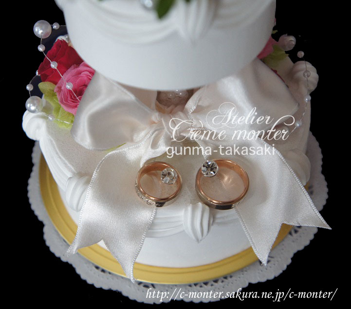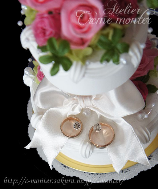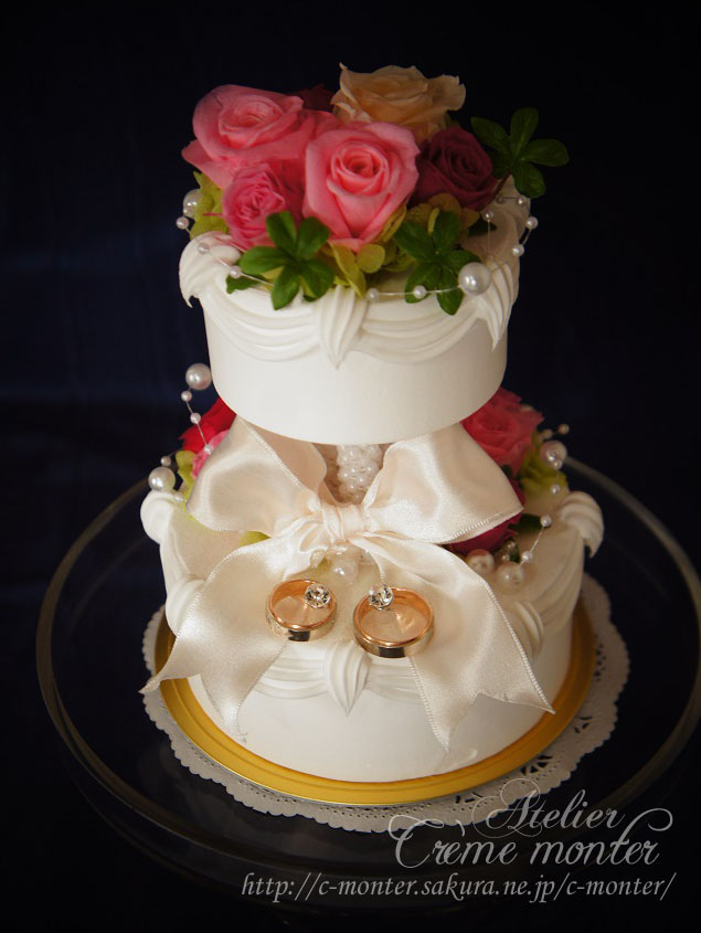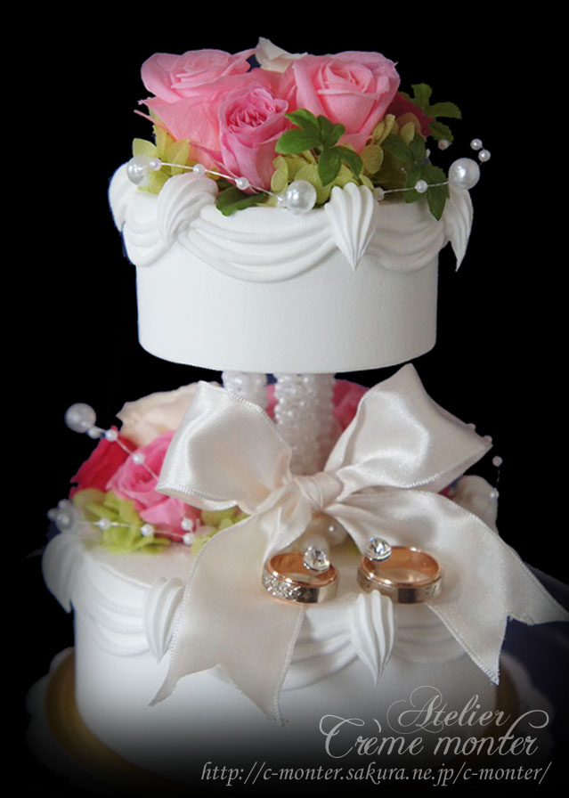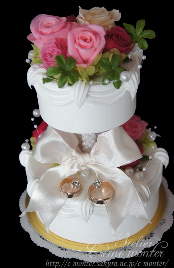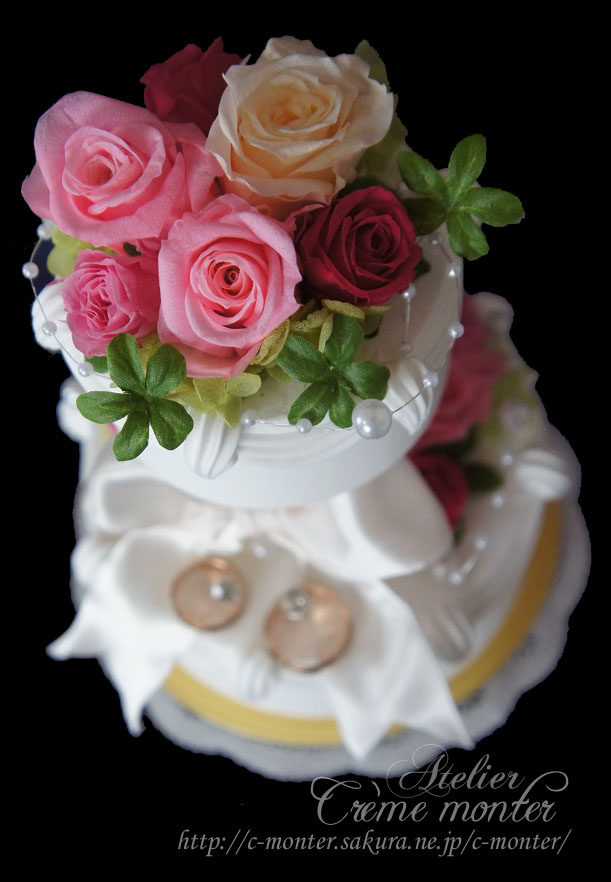 プリザーブドフラワーを使ったケーキ型リングピローです。